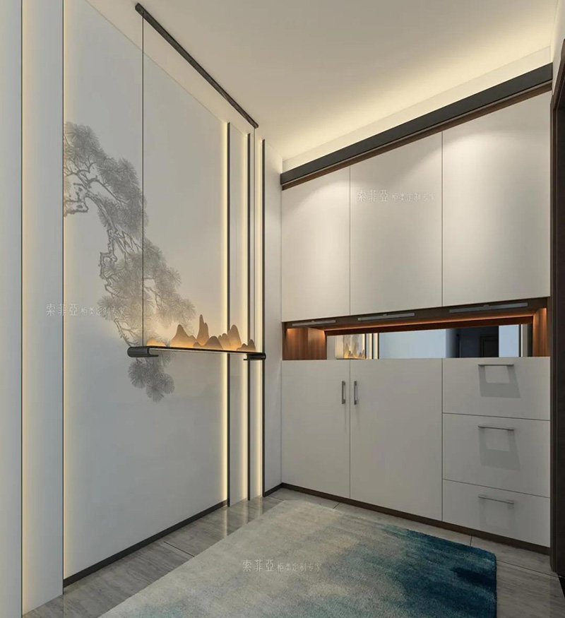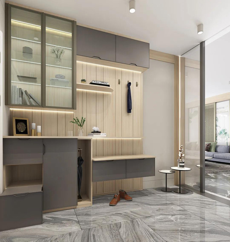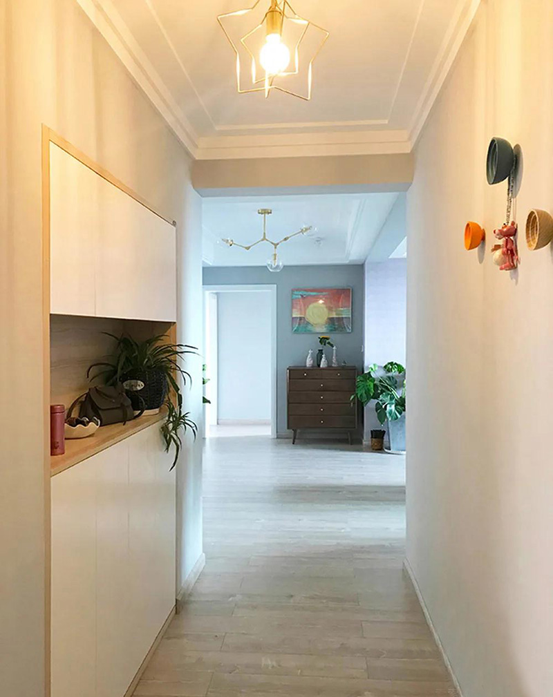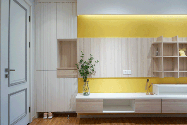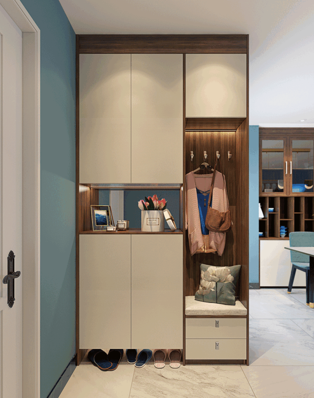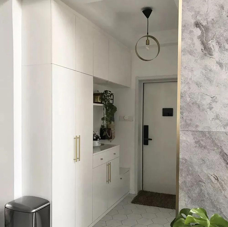 入戶櫃嵌墻形成一個整體,減少了櫃體帶來的壓抑感。