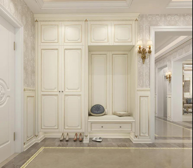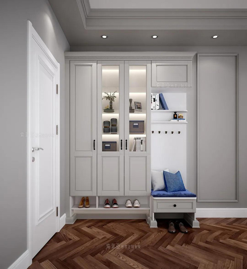 家有老人孩子,可適量減少儲物櫃,改為換鞋凳+臨時掛放區,方便坐著穿脫鞋子及隨手掛放包包、大衣。