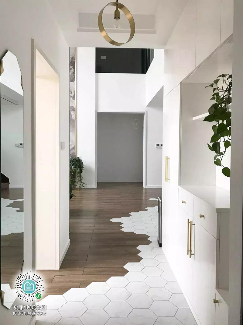 這時,你把鞋櫃懸空10-15cm設置成便鞋區,進出門不用彎腰、開門便能穿脫鞋,這樣就不易亂了。