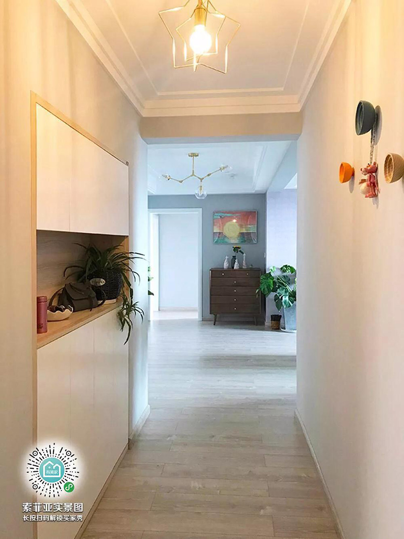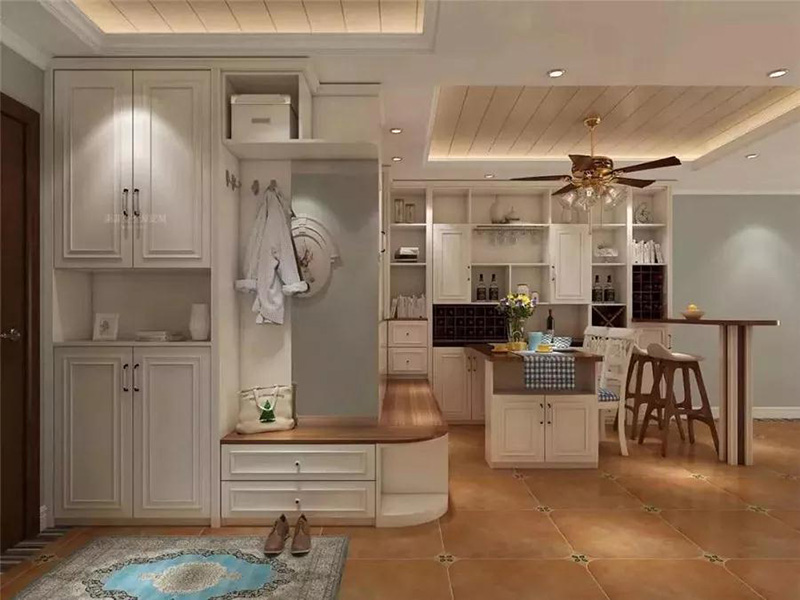 如果你家玄關比較狹長,建議削墻做嵌入式的鞋櫃,可和進門吊頂結合起來設計。