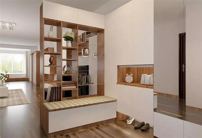 如果空間足夠,還能設置L型隔斷鞋櫃,相當于硬凹一個門廳出來,收納力杠杠滴↓