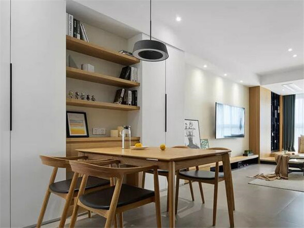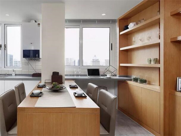 2、櫥櫃樣式操作臺延伸至餐桌旁。敞開式廚房,可以將部分櫥櫃功能延伸到餐廳中。把餐邊櫃當做備餐臺,櫃子上方安裝層板,下面帶有照明燈,一些不需要烹飪的食物可以在這里制作完畢,端上餐桌。因為經常要在桌面上處理食物,所以在選擇時注意桌面的材質是否好清潔。用于備餐臺的餐邊櫃,櫃子還是選擇帶有抽屜的款式,用于存放廚具。