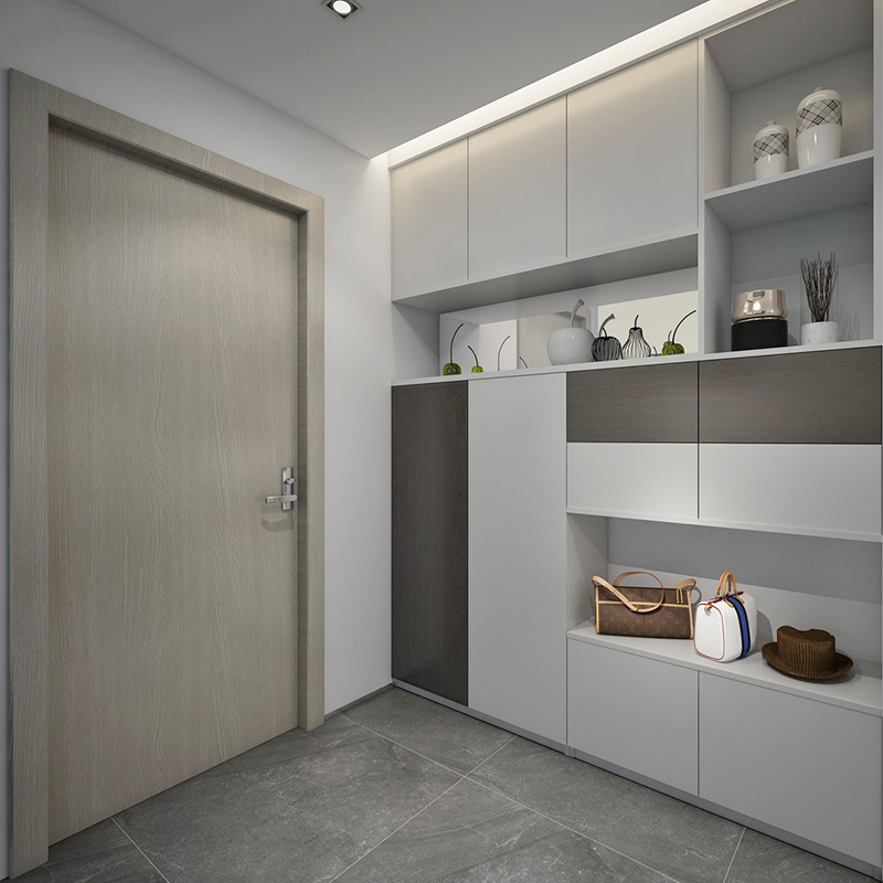 玄關處的鞋櫃只是放置平時常穿的鞋,不可能一勞永逸,所以設計師在設計上鞋櫃內部可以以根據家庭成員來區分,分為男用、女用、兒童用等區域,也可以常用和不太常用來區分,並根據鞋子大小來設定內部隔板。同時要根據房屋的整體裝潢風格設計,最好用百葉門,可以防止異味,而且櫃內每一格都不要釘死,預留多個不同的高度,這樣自由而靈活,也能使鞋外面的泥土灰塵直接掉落到最底層,方便清理。