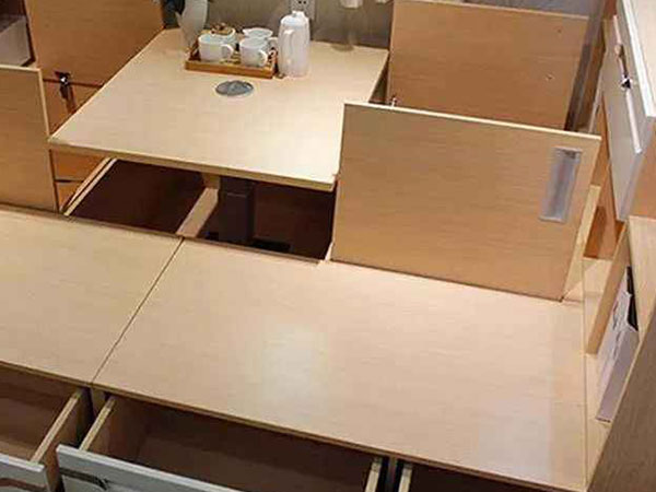 升降臺:日本傳統和室中央都有一個和室桌,北京一品和和室榻榻米升降桌其實為中國和室桌的改良版,分為手動和電動,這種升降桌和傳統和室桌比起來,有節約空間和方便使用者使用的優點。不使用時,它與地面嚴絲合縫地結合在一起;使用時會緩緩升起到合適的高度,品茗聊天,可以不受坐姿所限,同時基座下還有空間容納使用者的雙腿,很適合中國人的習慣。