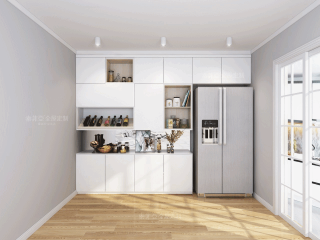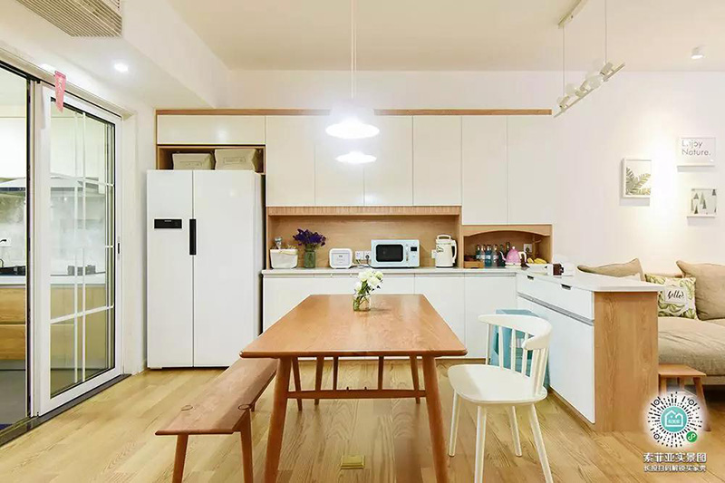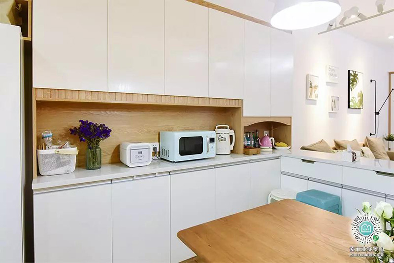 冰箱嵌入餐邊櫃,微波爐,豆漿機,煮水壺,統統放在餐邊櫃的開放區。