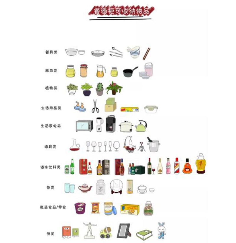 ▲餐邊櫃收納指引:頂櫃放不常用的雜物,空曠的臺面放家電、水果、紙巾等常用物品,底櫃放碗碟,刀叉等餐具。