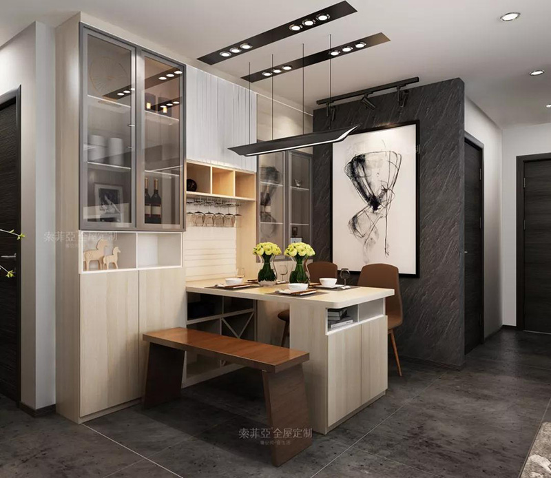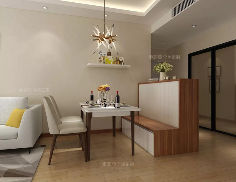 隱藏在餐邊櫃的餐桌,兩人進餐剛剛夠,一個人吃飯也不會感覺空落落,輕松營造溫馨的就餐氛圍。