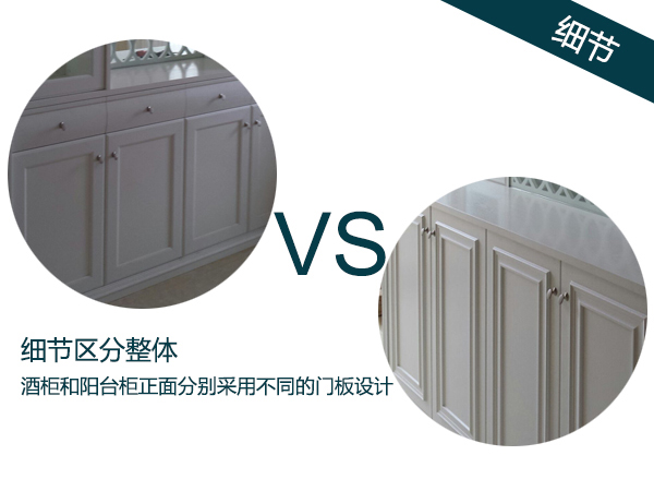 前后櫃子的不同設計,酒櫃正面采用立體拼框掩門,同時增多抽屜,即讓整體充滿簡約時尚感,又起到充分的分類收納作用;陽臺櫃正面采用吸塑掩門,設計細膩大方,讓整體不顯單調又不失簡約。