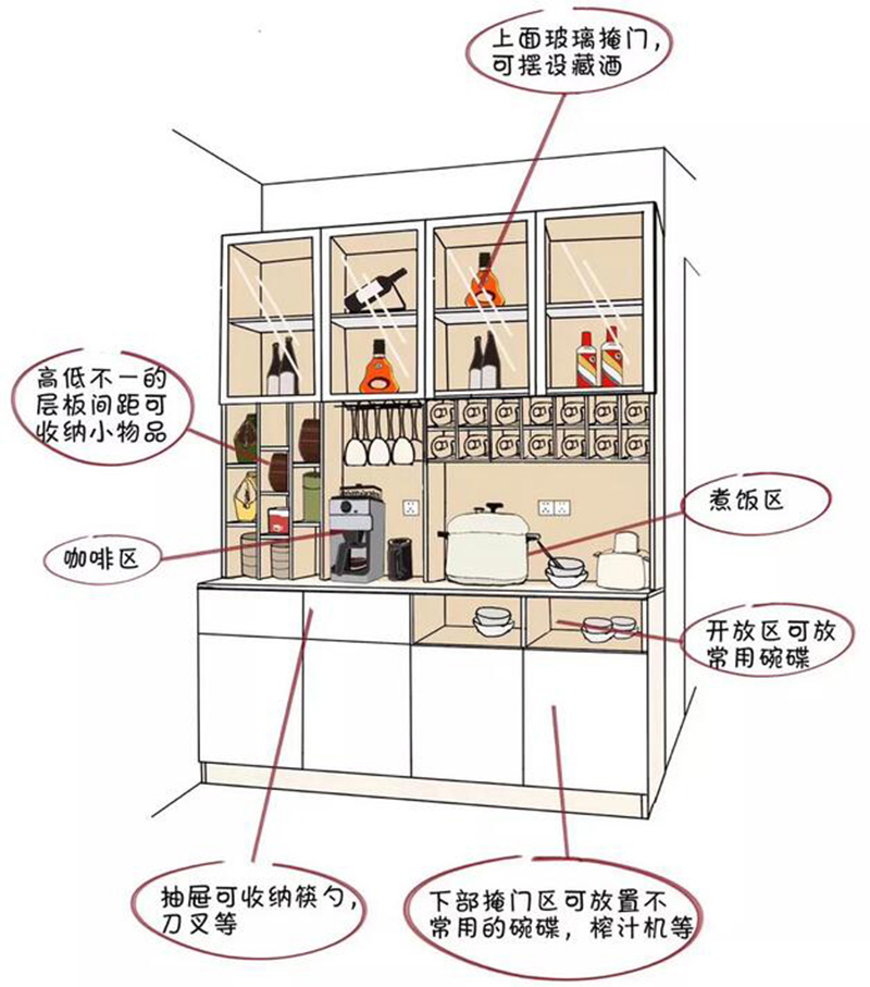 在確定了我們需要餐酒櫃來收納哪些物品之后,就要考慮怎麼合理收納這些物品了。