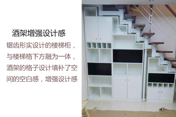 樓梯底部的設計有別于常規的設計方式,鋸齒形的樓梯下方富有創意感,所以在設計樓梯櫃的時候也充分地運用到這一特點,鋸齒形的設計與樓梯下方完美契合,時尚、動感,而為了加強旋律感感覺,在樓梯櫃的格子設計酒架,既滿足了收納的需求,同時在視覺上更加有沖擊感。