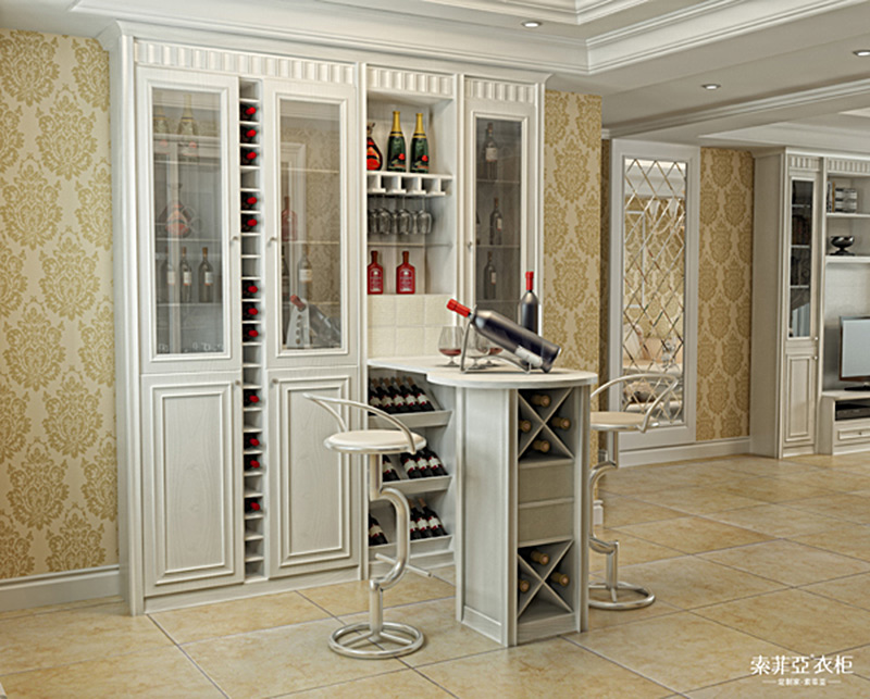在這組家裝酒櫃效果圖中,酒櫃采用實木顆粒板和透明玻璃趟門接連而成,以白橡的淺色調為主,門和酒櫃起到了空間隔斷的功效,簡潔美觀,方便欣賞櫃中美酒,網格的藏酒孔設計和掩門櫃相接,雖然藏酒量不多,但不失分毫的輕奢格調,阿維尼翁的獨特風格,給人一種歐式的浪漫之感。