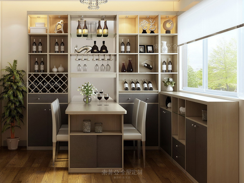 3、若擁有敞開式客廳、餐廳,可用落地式酒櫃做屏風,分隔生活區域。