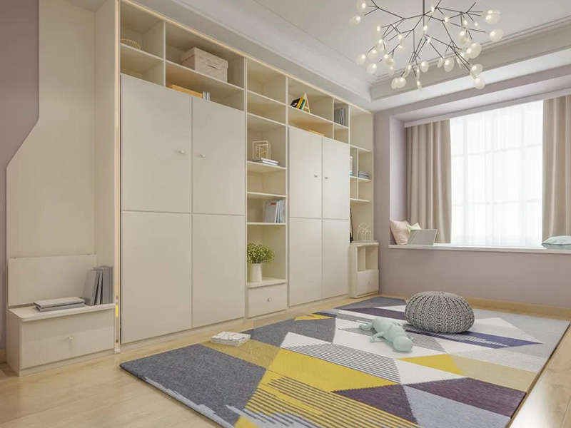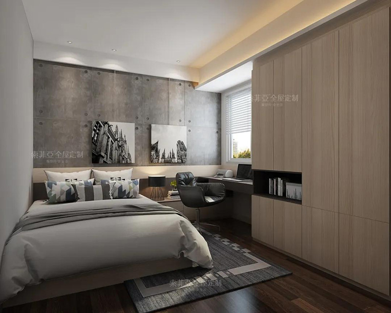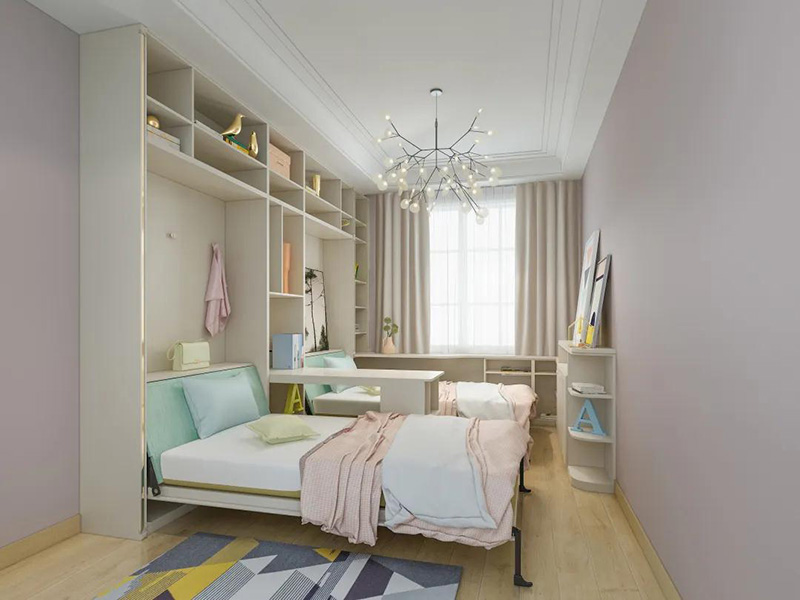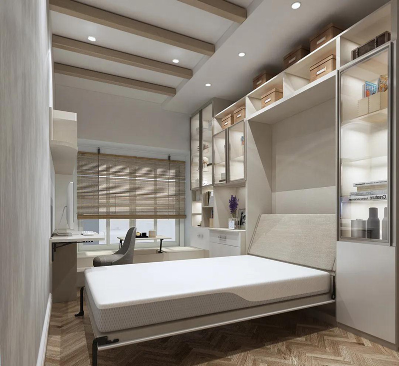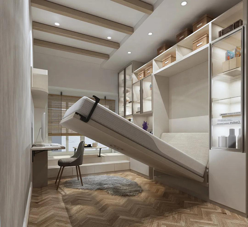 立翻床與衣櫃的一體化設計,收起時,床與櫃體融為一體,完美隱形,騰出過道,不占臥室動線。
