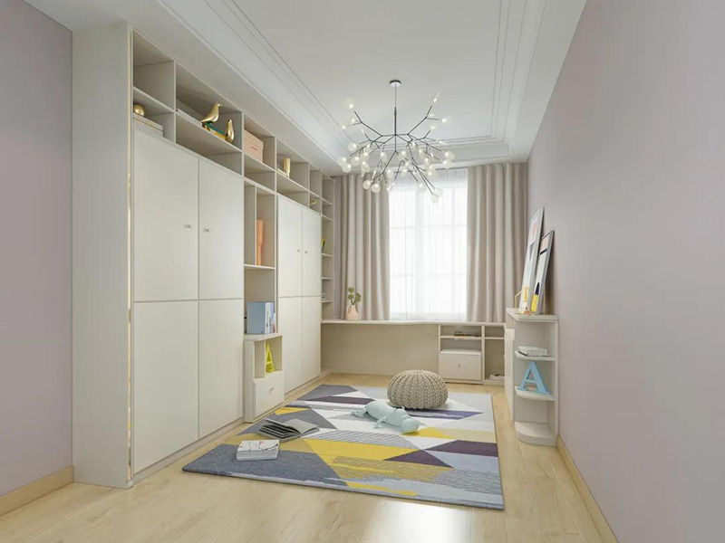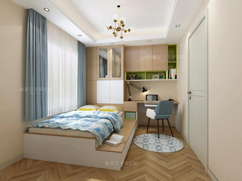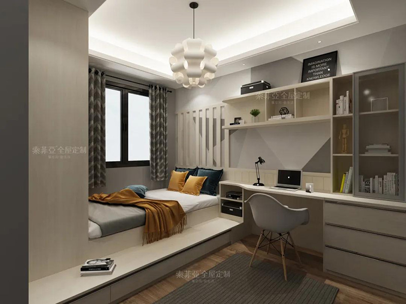 在臥室直接使用榻榻米床書桌一體化的設計,統一性更強,書桌的位置也能更加合理。