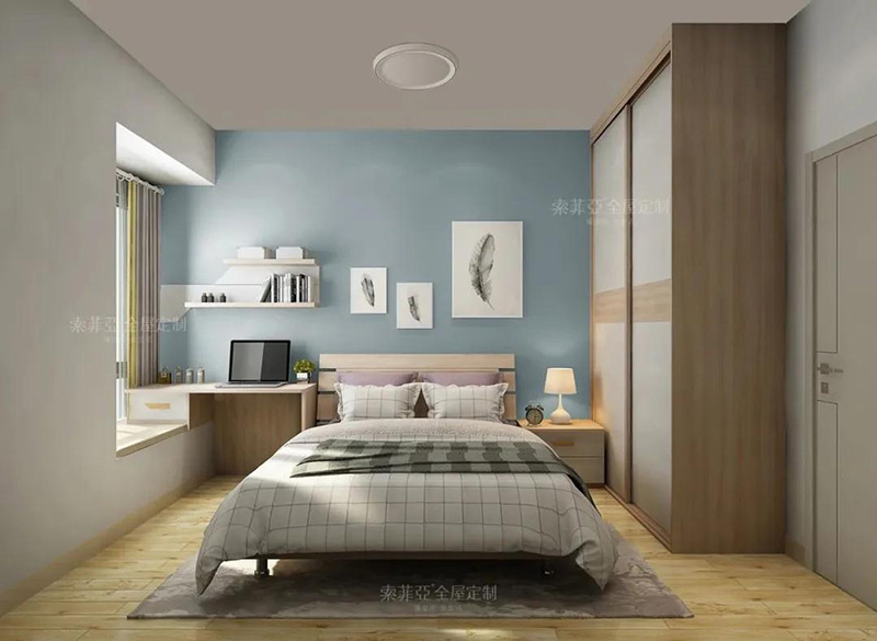 既然如此,何不將床頭櫃替換成書桌,床頭書桌一體化的設計,不僅讓空間有了更多的功能,書桌也能代替床頭櫃發揮收納擺物作用。