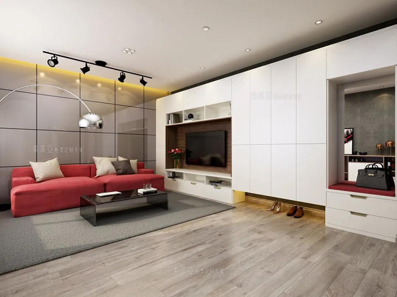 假如你家的戶型是入戶和客廳相連,那么完全可以利用入戶櫃+電視櫃組合設計來輔助動線布局。