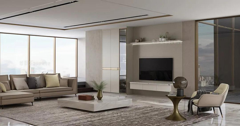如果想要客廳更加規整,收納不外露的話。可以選擇一門到頂的超高門設計,家居用品隱于其中,還很輕奢大氣。