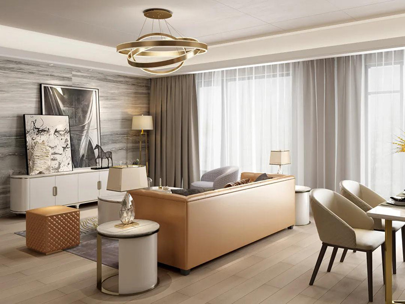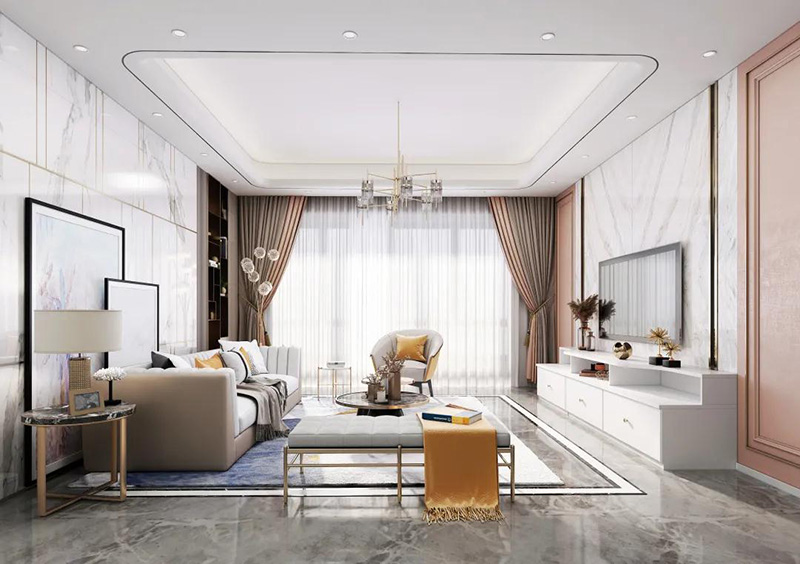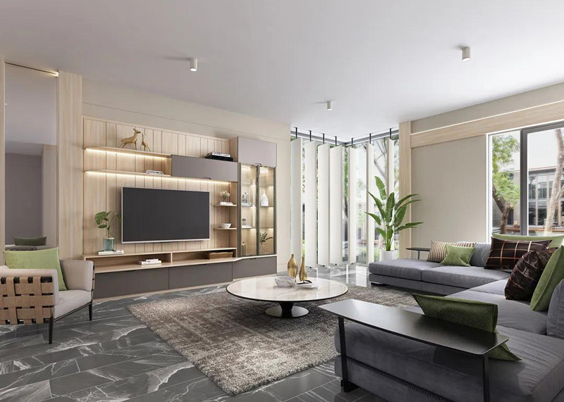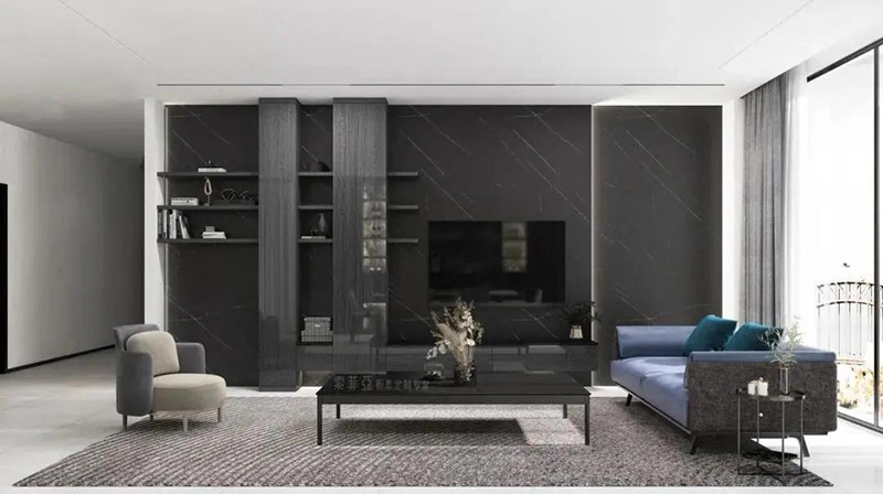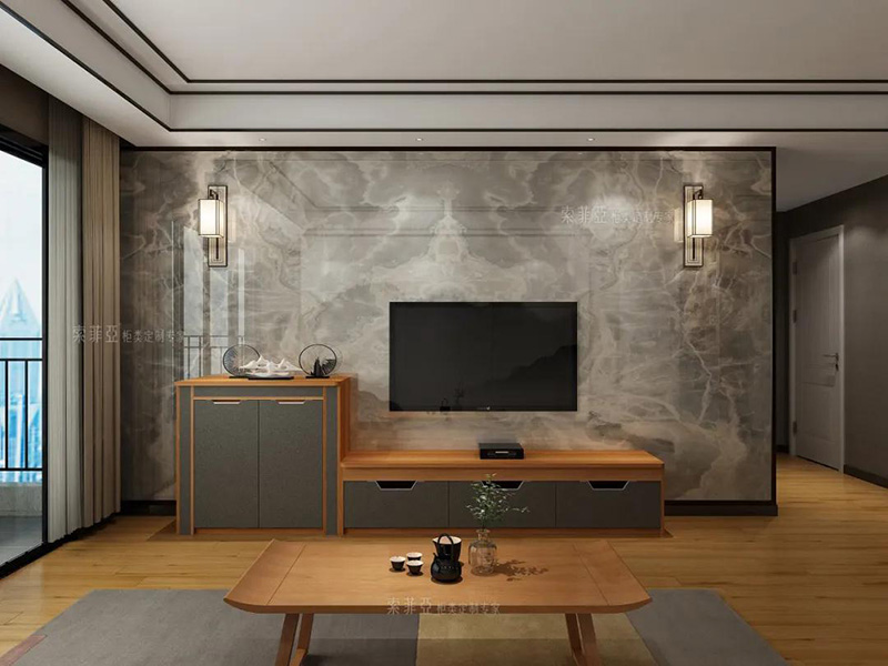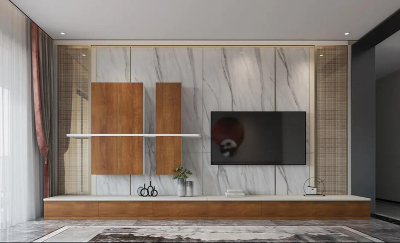 如果追求別致新鮮,電視櫃可以嘗試以金絲柚木為主色調,其極具質感的原木肌理和電視背景墻的大理石紋形成絕美呼應。