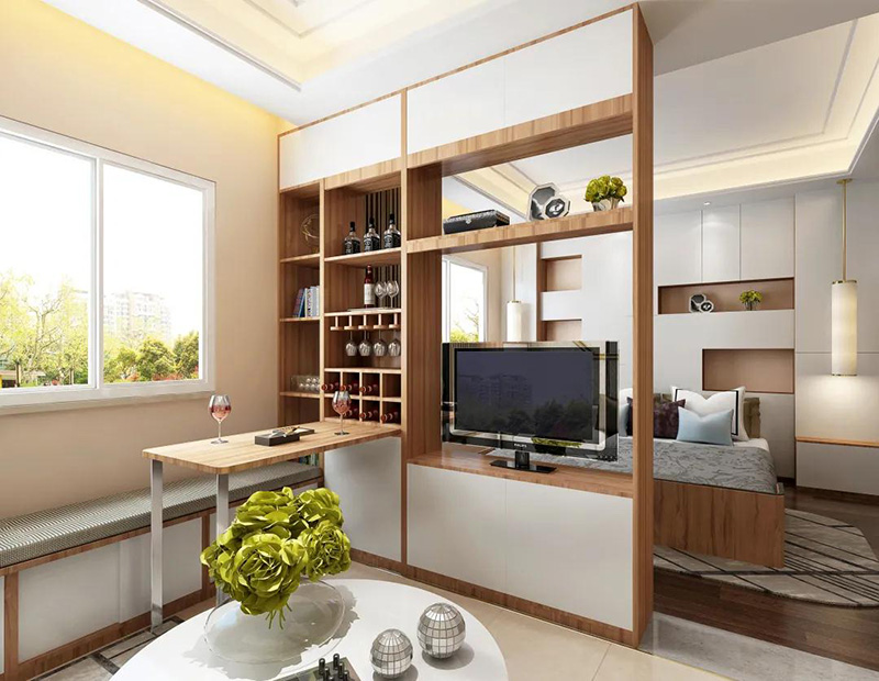 原木色+白色的組合有多好看相信已經無需贅述了,這種結合餐邊櫃的隔斷式多功能電視櫃設計適用于小戶型或公寓。