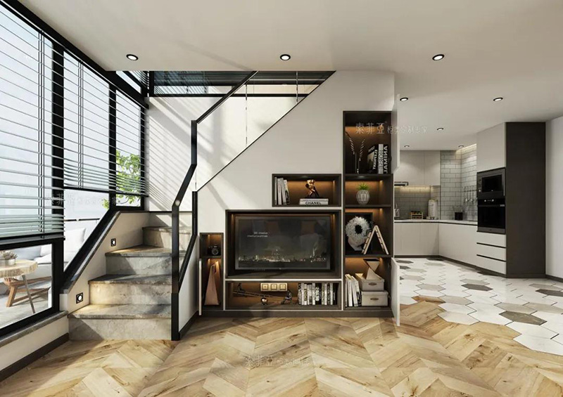 公寓戶型可能將臥室、辦公、餐廳、客廳擠在一個空間里,完全沒有獨立的客廳,那電視櫃可以裝在哪里呢?樓梯下方!