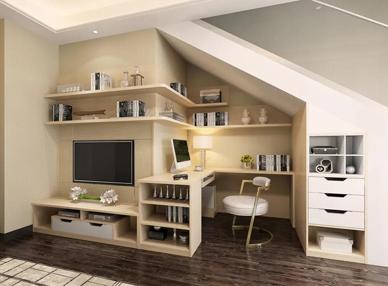 樓梯下方有柱子,還可以做電視櫃+書桌+書櫃一體化設計,擁有電視櫃的同時還有一塊屬于自己的辦公區。考慮到位置較小,這里的電視櫃可以簡單用隔板+矮櫃設計就好。
