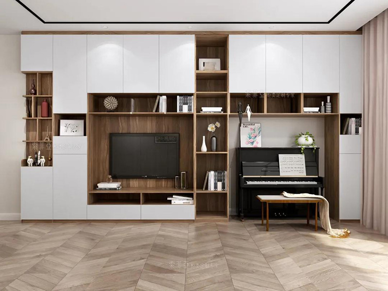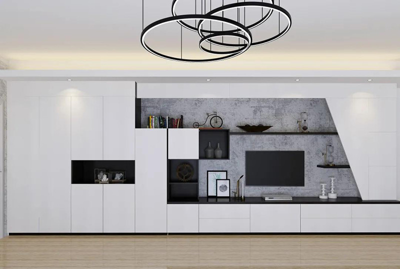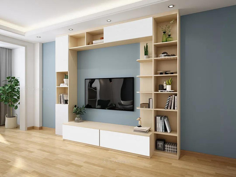 如果希望電視櫃更有設計感,可以嘗試半包圍型電視櫃設計,吊櫃/隔板+側櫃+矮櫃,外形大方又能裝。