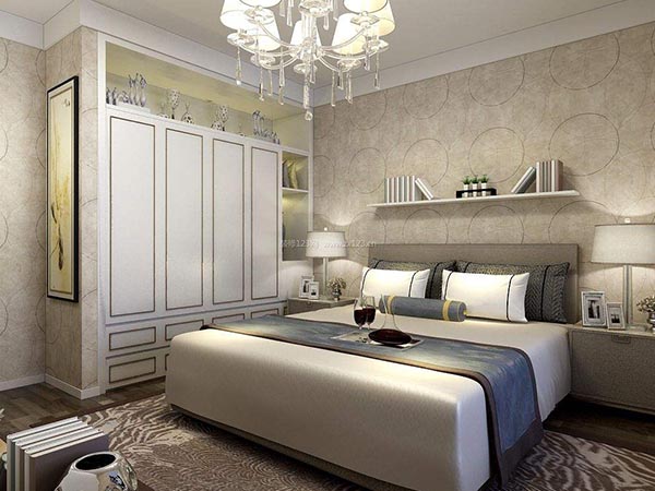 (2)墻壁約有1/3的面積被家具所遮擋,而人的視覺除床頭上部的空間外,主要集中于室內的家具上。因此墻壁的裝飾宜簡單些,床頭上部的主體空間可設計一些有個性化的裝飾品,選材宜配合整體色調,烘托臥室氣氛。