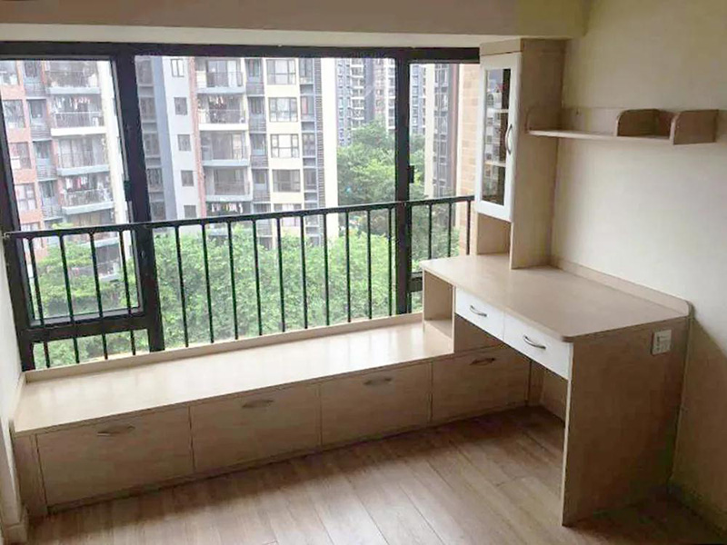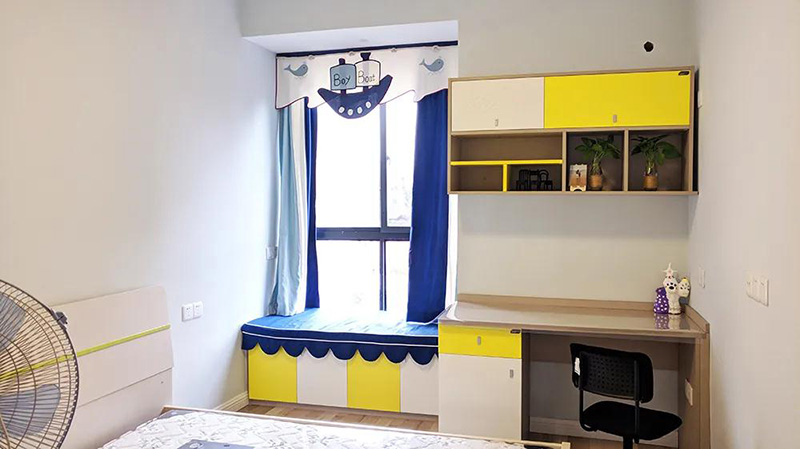 飄窗四周都搭建起了櫃子,有坐臥區也有儲物區,還有書櫃和書桌。