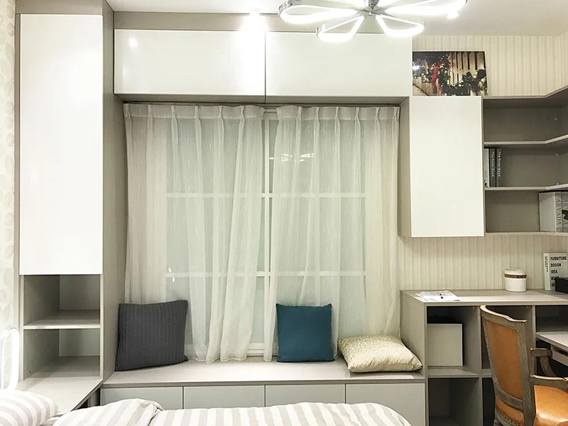 客製化一整面儲物櫃,中間留出窗口,收納和休息的功能都有了。