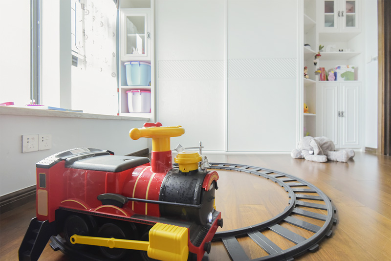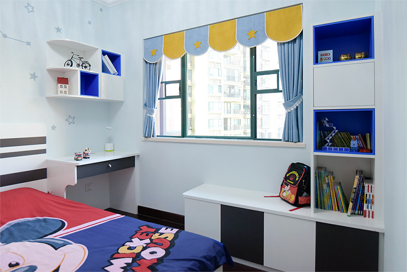 在飄窗兩邊的墻面上,增加收納櫃,書籍、玩具隨手拿取。