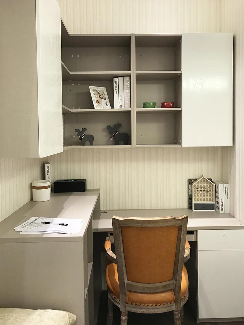 一長排的收納地櫃和書桌,起碼給房間提供了近三分之一的收納空間。