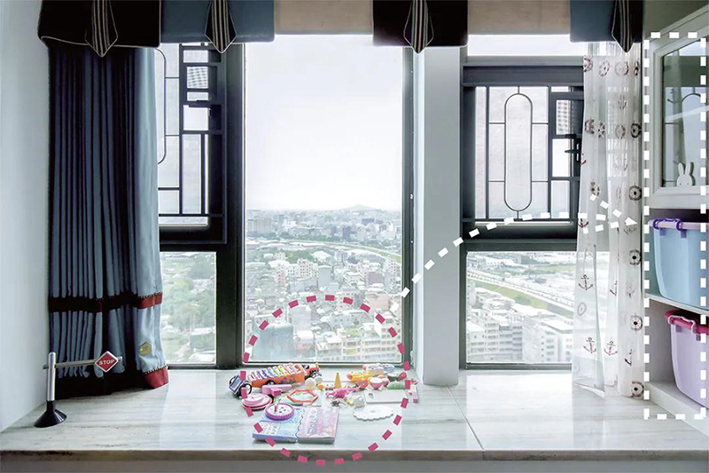 飄窗下方的抽屜櫃,用來收納孩子的玩具,十分方便。