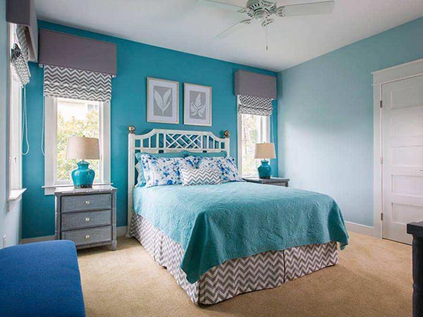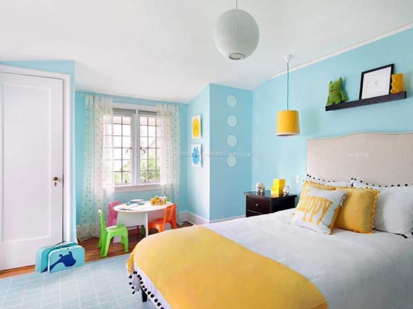 3、藍色是平常生活中大多數人群親昧的色彩之一,它的安靜淡雅陶冶著人們的情感和靈魂。藍色也是家居臥室設計中常用到的色彩,特別是在兒童房青年房的設計中,藍色的運用有助于睡眠,能讓人們忙碌一天的身心都得到放松,通常與白色搭配,營造一種時尚雅致的空間氛圍。
