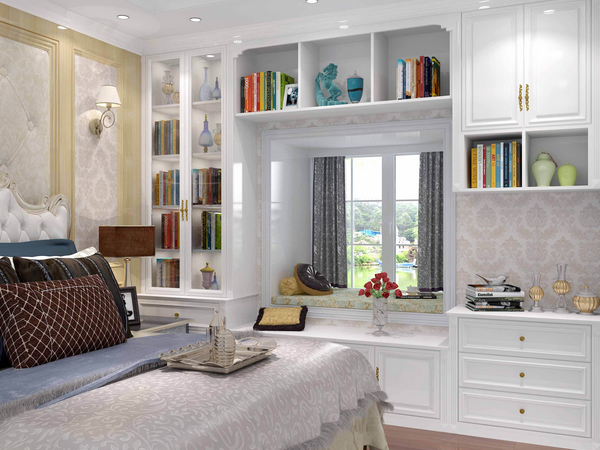 對于那些小戶型的的臥室來說,由于空間面積有限,因此我們在對臥室飄窗設計設計時,最好在下方增加些儲物空間,這樣能大大增加我們的收納空間,同時我們還可以將飄窗部分墻面設置成織物架,可以在上面擺放些書籍。