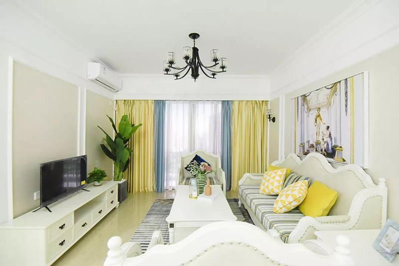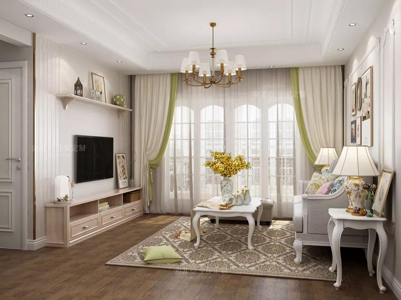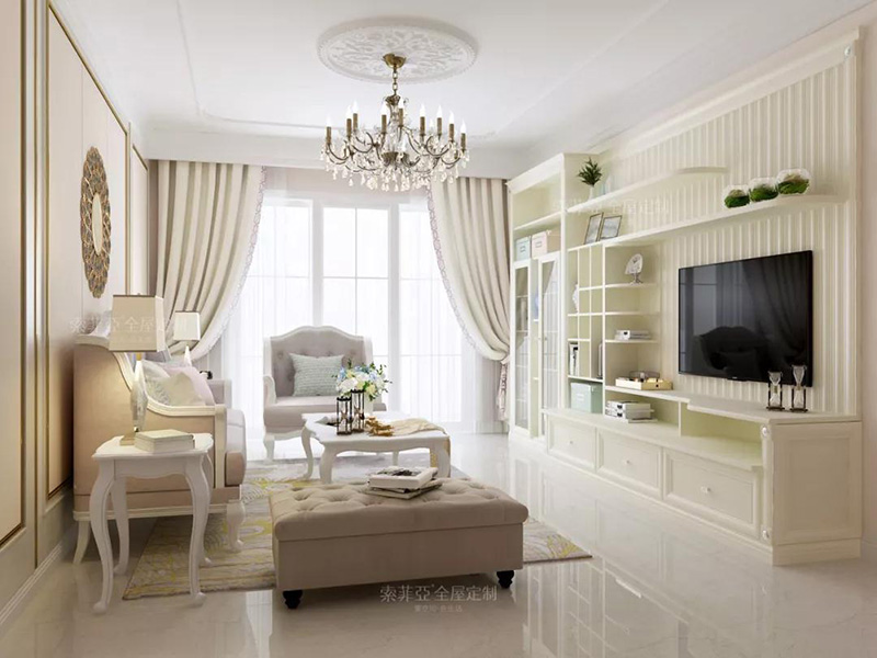 簡歐風電視櫃配以柔美淺色調的沙發、窗簾等軟裝家具,讓客廳更顯高貴優雅。