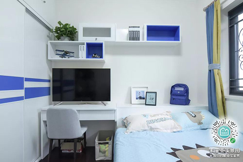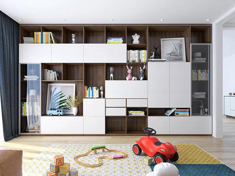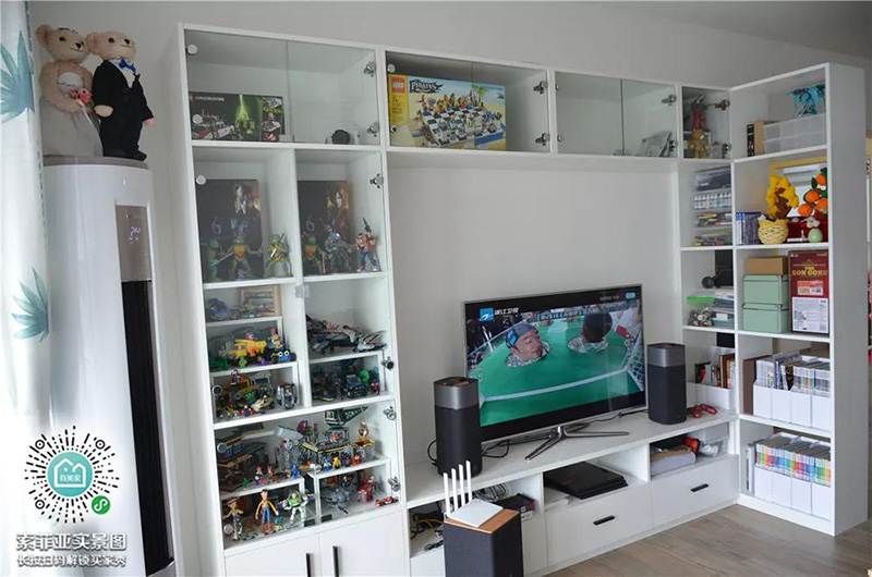 當客廳已經淪為小孩的玩耍區,那不妨將電視墻打造成收納墻吧,將玩具統統收起來,還可以避免小孩沉迷電視,保護視力。