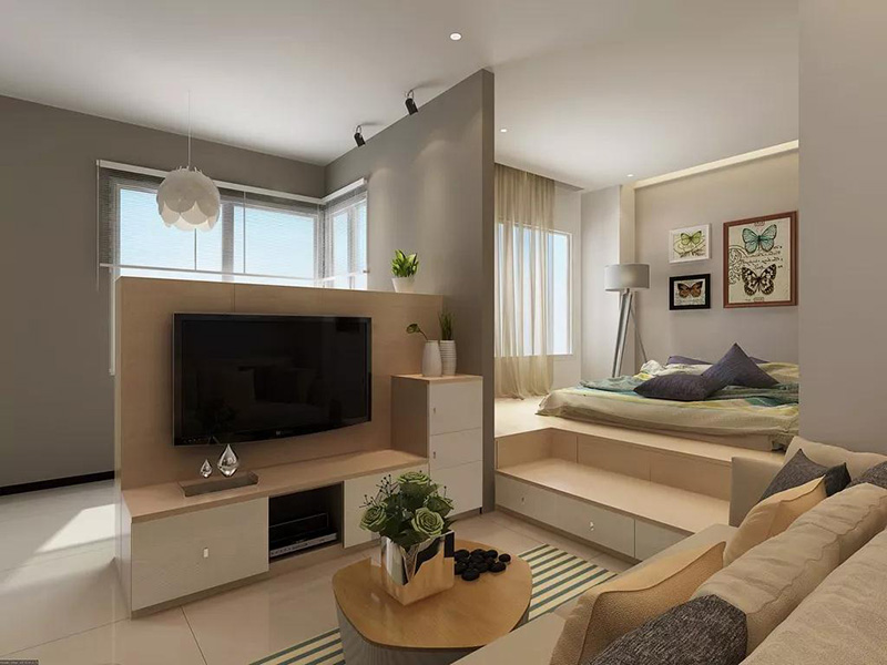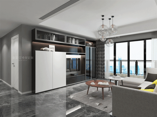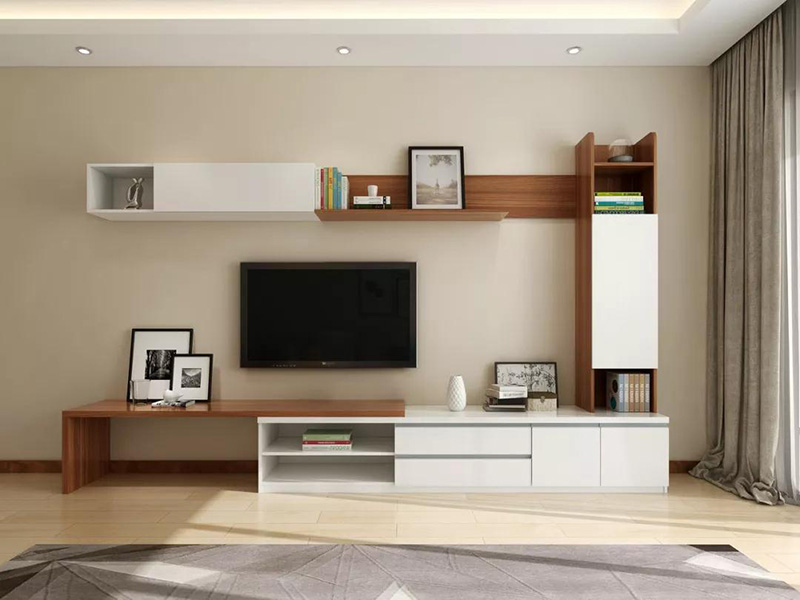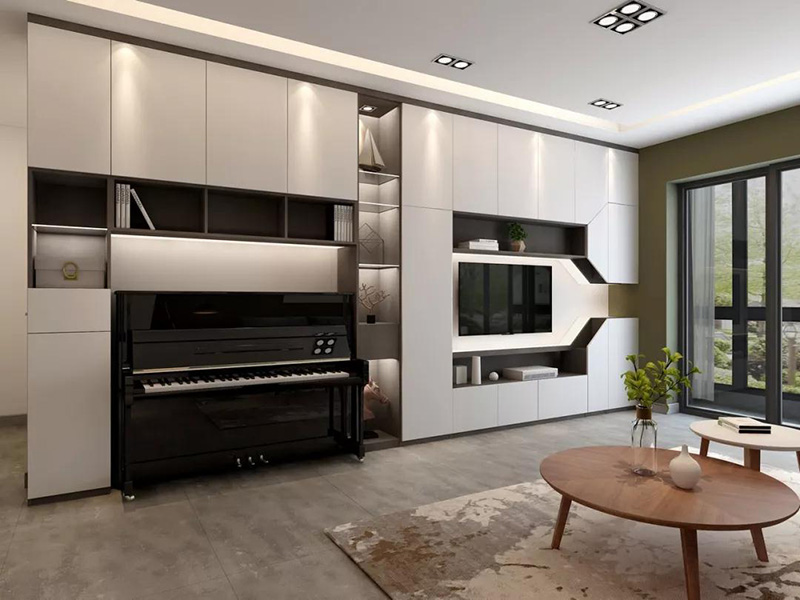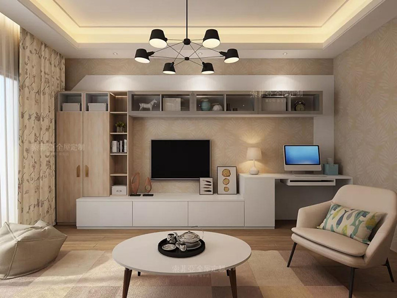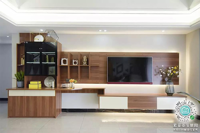 擔心一整面櫃子會顯得客廳壓抑,可以一邊矮櫃一邊櫃子,將櫃子“推”入墻,就更不會感覺壓抑了。