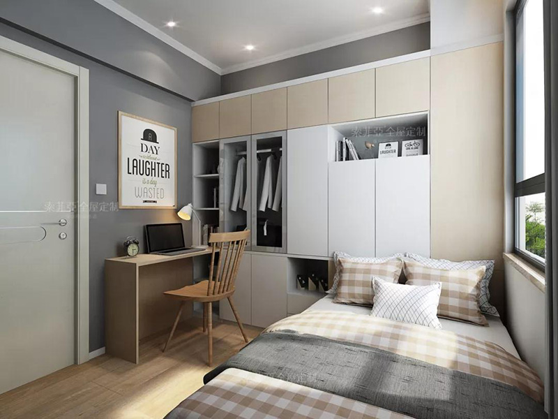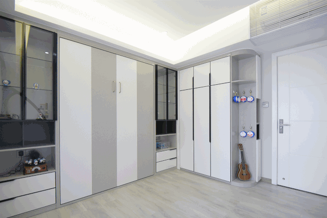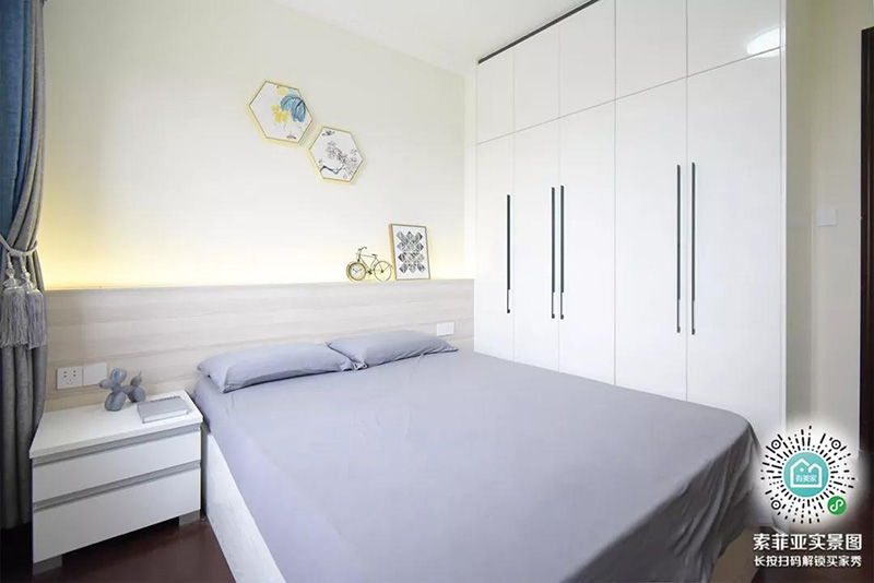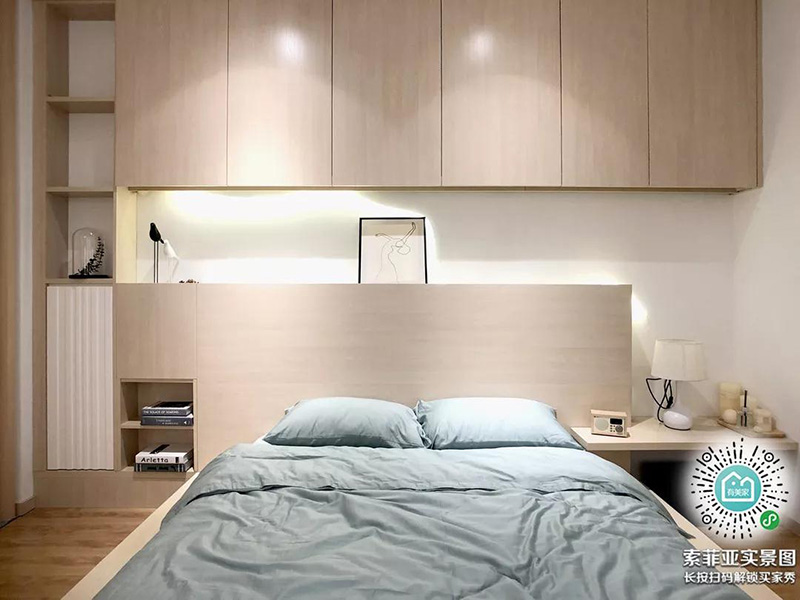 把床頭一整面墻做成櫃子,增加臥室的收納展示空間。