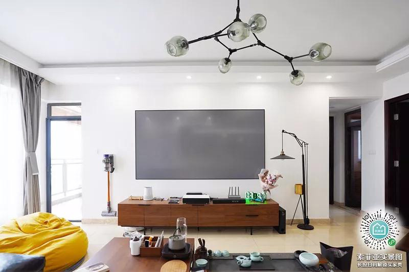 喜歡看電影,可以在電視墻上掛投影儀,如果覺得大白墻有點太空,還可以在底下擺些綠植、藝術畫、甚至擺個小矮櫃擺放工藝品、收納珍藏CD、錄像帶都可以的。
