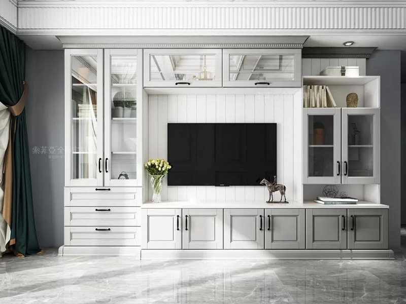 如何做到一整面櫃子,還不顯得壓抑?首先中間盡量留出空白,不僅可以擺電視擺藝術畫,還能顯示出層次感。