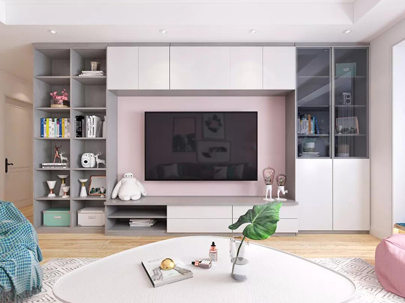 一整面背景墻,中間用來放電視,兩邊做成展示櫃,擺放精致物品,提升客廳顏值。