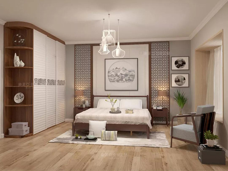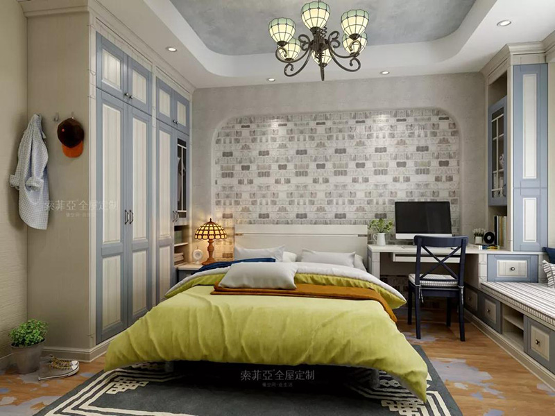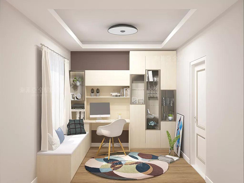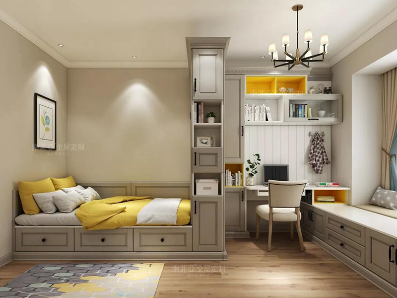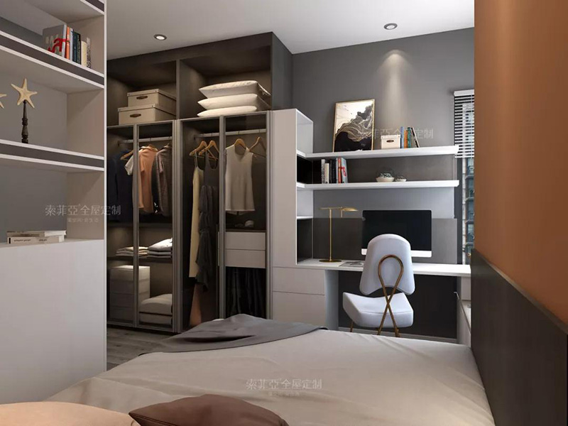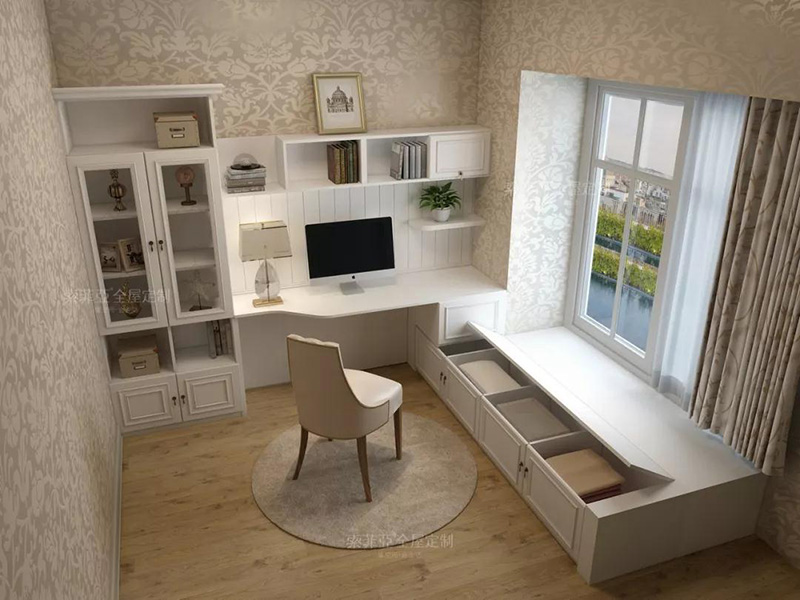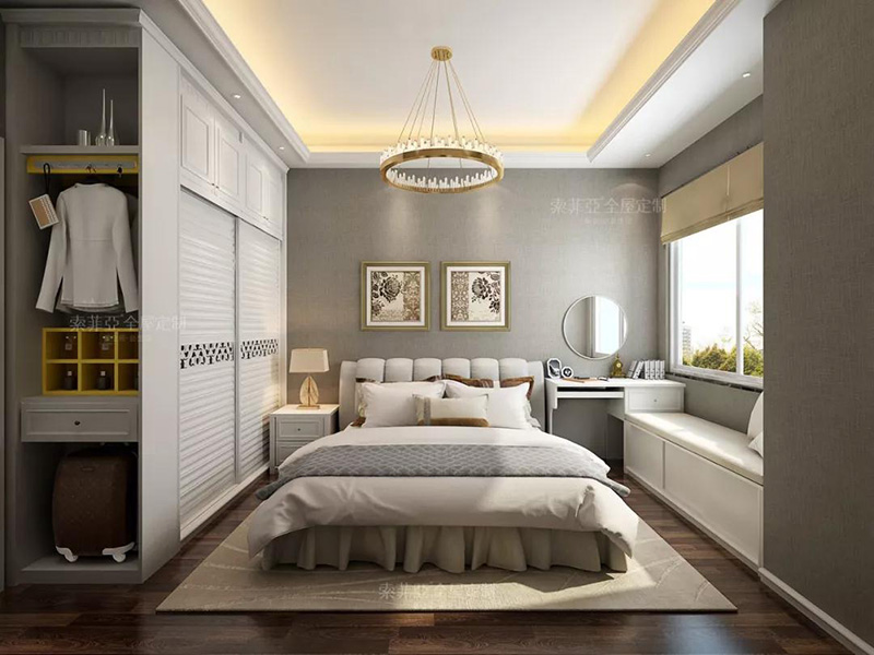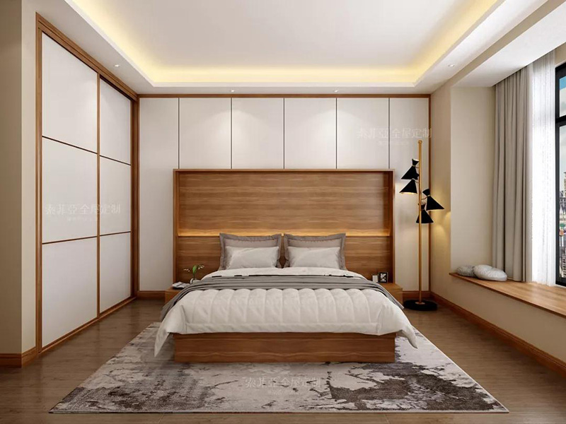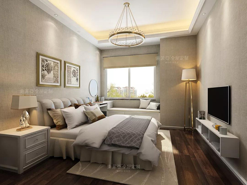 在有飄窗的臥室,如果寬度足夠,那飄窗的那一面墻都可以外擴50-60mm來設計成儲物櫃,實用又美觀。