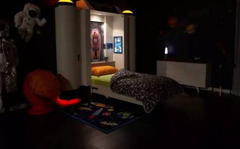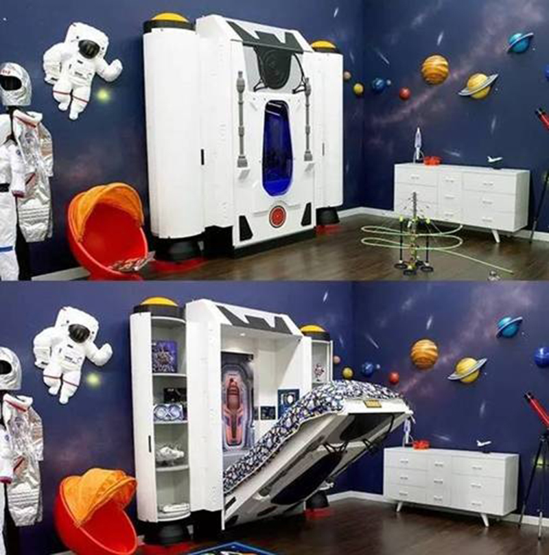 超級酷炫的以宇宙飛船為主題的兒童床,白天的時候可以收起來成為房間的布置,晚上放下來,立即讓你的小宇航員開啟奇幻的太空之旅。真的是“從睡覺都在培養寶寶的創造性和想象力”啊!