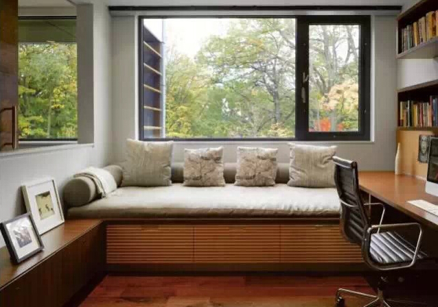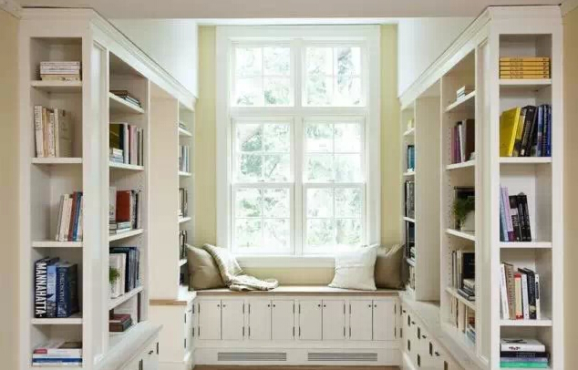 如果家中空間較小,而沒有辦法特地的空出一個地方設計成飄窗的話,不妨在滿滿的書架中掏出一個小小的飄窗吧。在這樣的飄窗上讀書想來肯定是件非常愜意的事情。