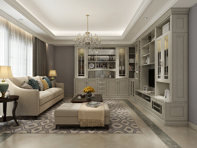 沙發背景墻被幾面落地飄窗所取代,使得空間愈加通透、明亮,頓顯大氣時尚之感。白色格子飄窗防盜窗與整個家裝風格相一致,完美的融為一體。搭配素色窗簾,十分美觀,起到了保護和裝飾的作用。
