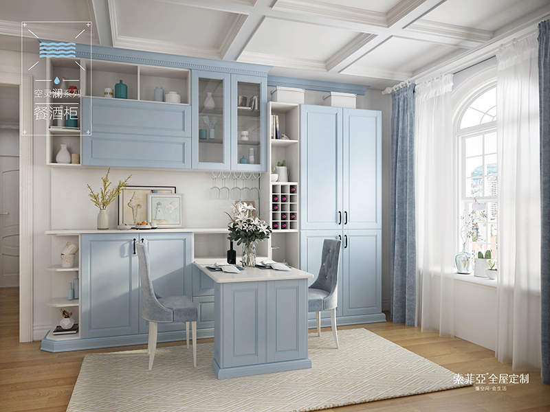 簡歐風格的餐廳,營造了一種優雅、浪漫的用餐氛圍。兩邊大大的飄窗提供了充足的光線,讓餐廳變得通透無比。飄窗按上了格子防盜窗,為家居安全帶上了一把保護傘。飄窗再配以餐邊櫃和儲物櫃,整體看上去既安全美觀又儲物豐富。