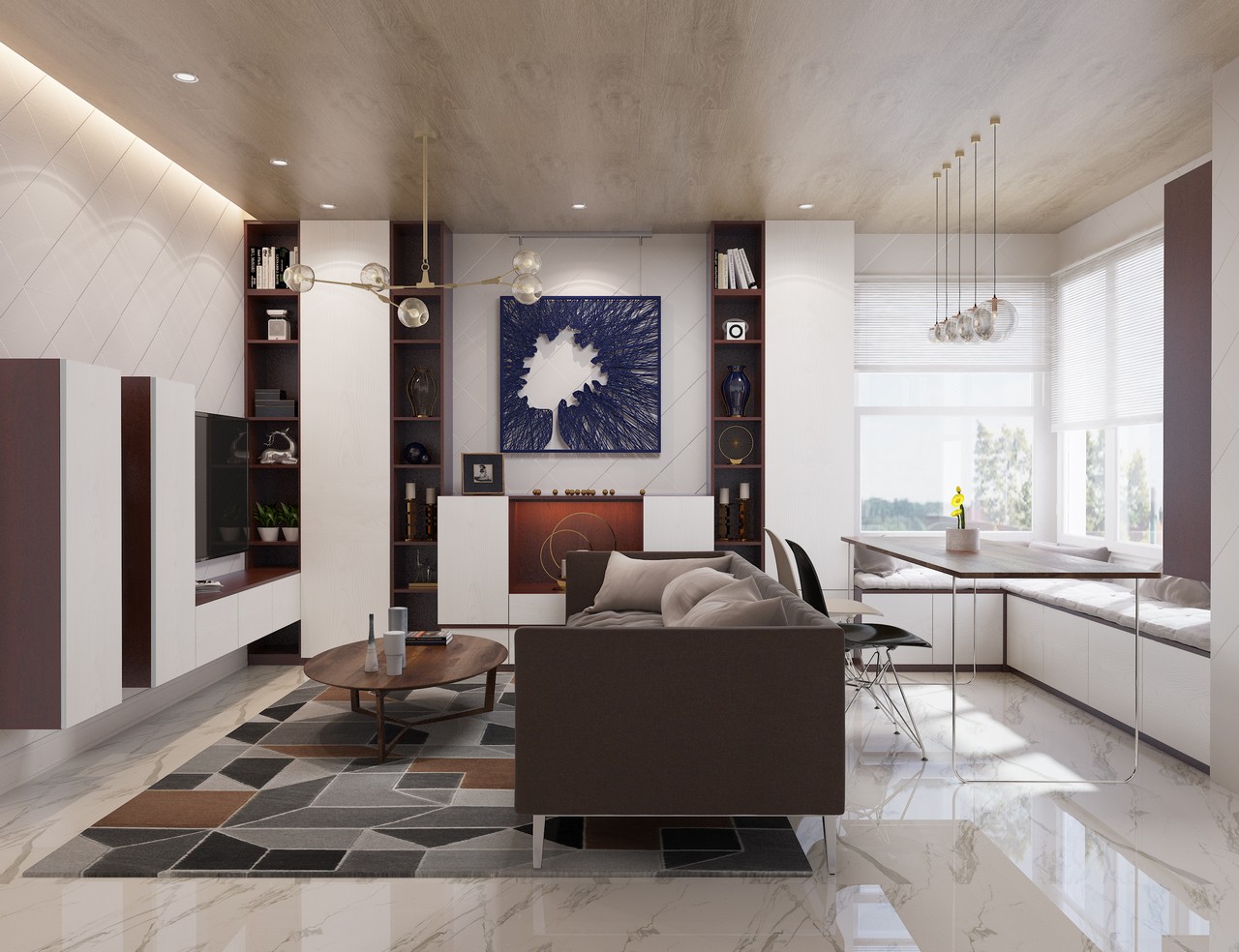 這間客廳小小的飄窗被充分的利用起來了,飄窗櫃設計增加儲物空間,同時還具有榻榻米休息功能。旁邊辦公區的設置能更好的享受明亮的採光,便于工作和學習。飄窗防盜窗采用木質構造,方格形式更具保護效果。