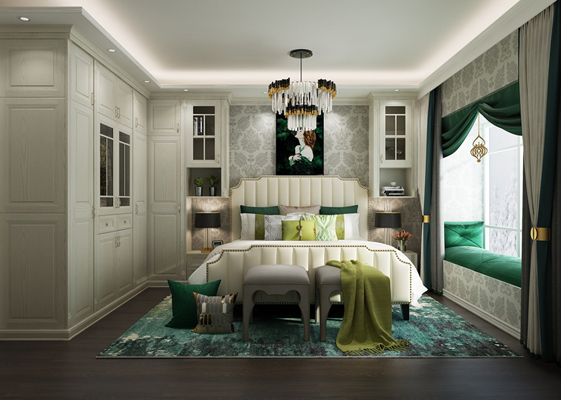 寬敞、優雅、恬靜的歐式風格臥室,大大的落地飄窗讓整個空間更加明亮,讓視野也更加開闊,更具通透感。飄窗防盜窗設計獨特,格子形式設計,起到更好的保護作用,同時也不影響視覺效果。