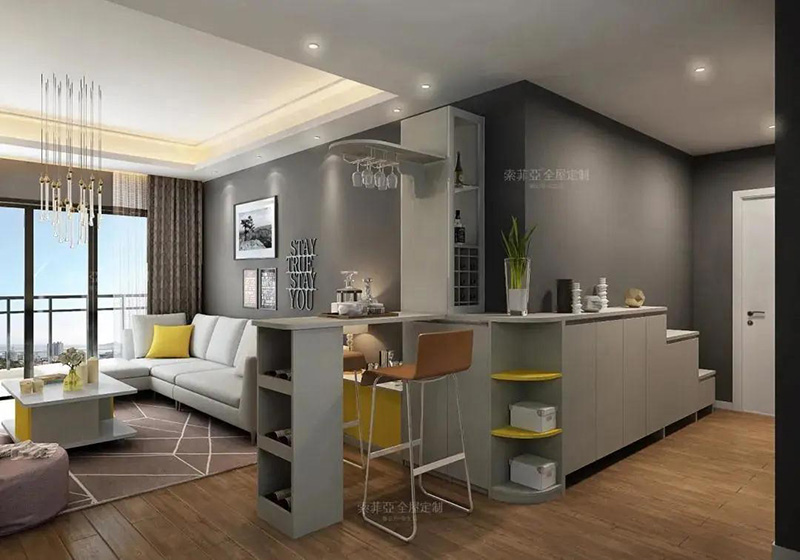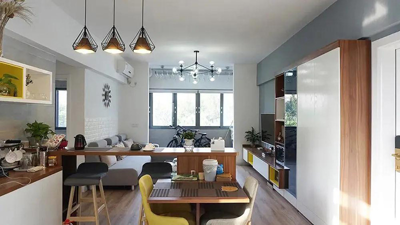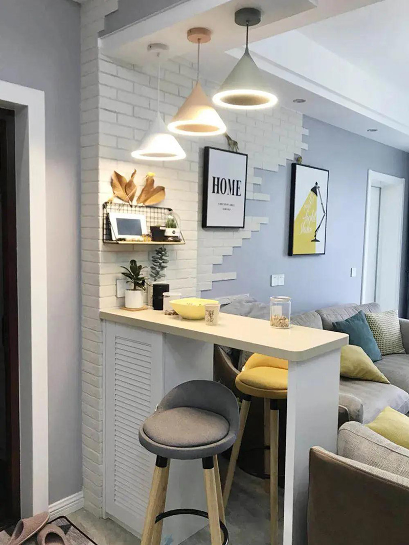 如果覺得矮櫃隔斷太過樸實,還能在客餐廳之間選擇吧臺隔斷,空間質感瞬間不一樣。