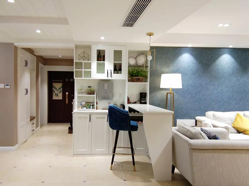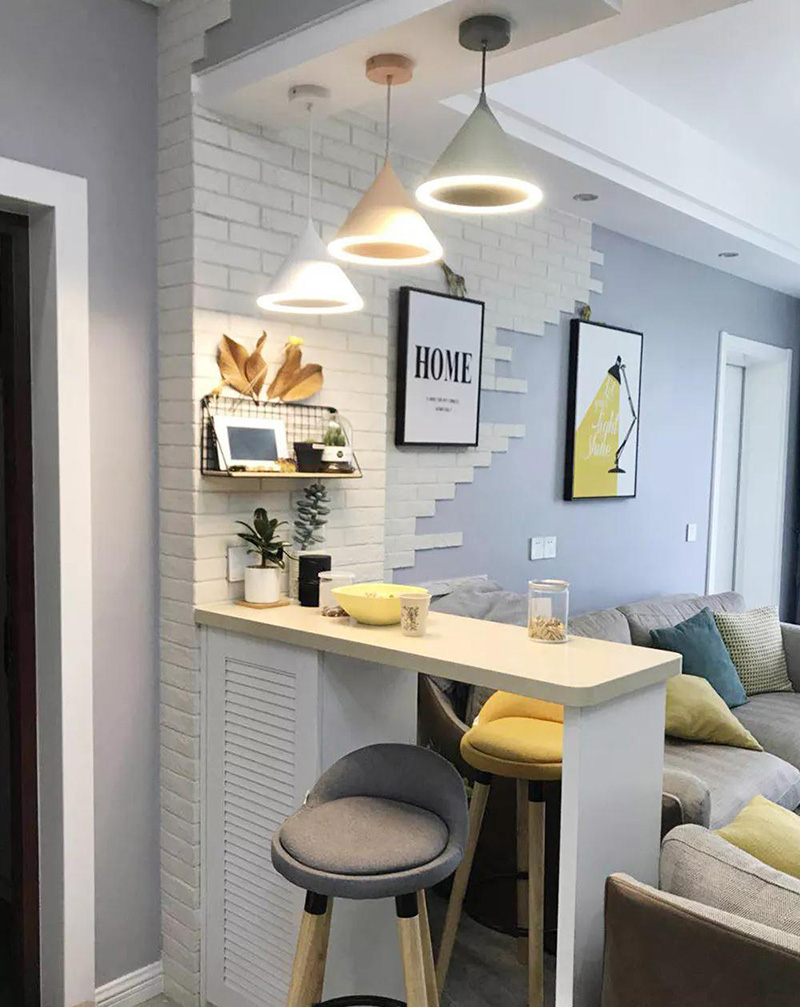 戶型沒玄關,進門正對客餐廳太沒隱私?垂直于沙發墻裝上小小吧臺,既承擔了隔斷功能,還裝飾了入戶區。